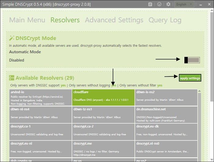 'Resolver' 탭을 클릭한 후 'Automatic' 모드를 해제하고 'cloudflare'만 선택된 상태로 적용해주시면 됩니다.