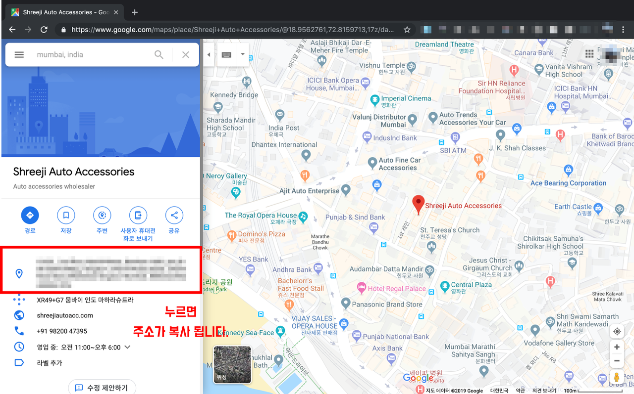 인도 아무 도시나 검색해서 확대해 보면 건물이 나오는데, 건물을 찍으면 좌측에 주소가 나옵니다.
