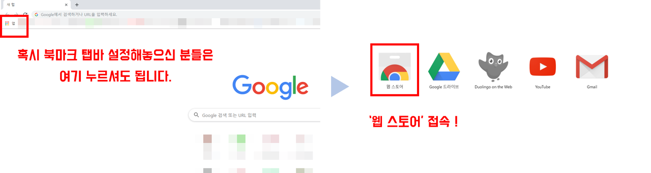 북마크 탭 켜놓으신 분들은 크롬을 켜시면 좌측 상단에 이렇게 '앱'이 있는데 이걸 누르신 뒤에 '웹 스토어'를 누르셔도 됩니다.