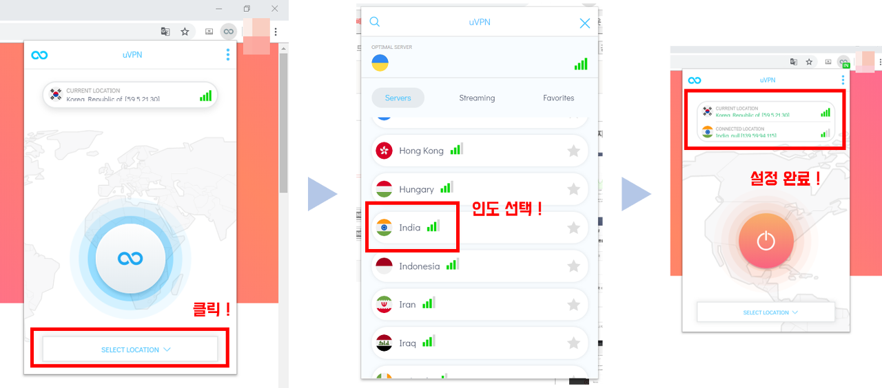 2. VPN 어플 실행해서 국가를 '인도(India)'로 설정