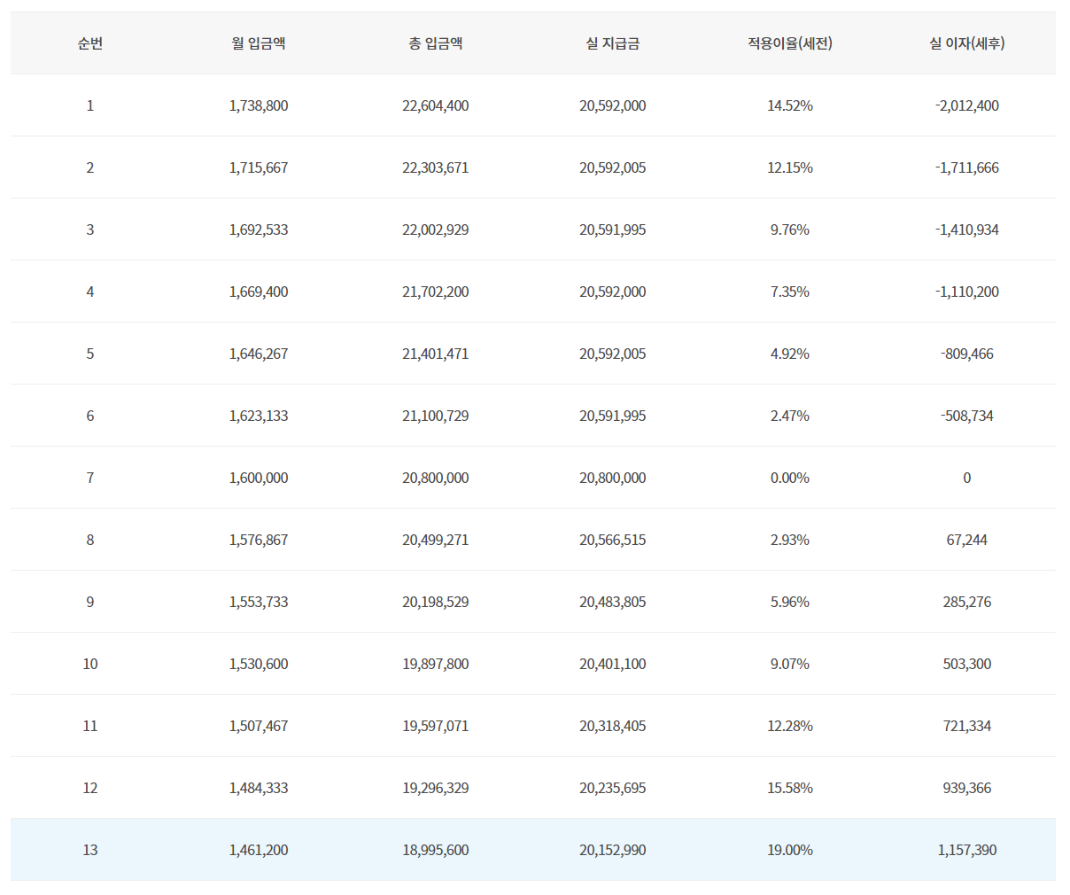 자, 놀랍지 않나요? 9번째 순번에 있는 사람은 월 937,513원만 9번 넣고 8,780,107원을 수령합니다. 위 표처럼 342,490원이라는 20%에 달하는 이자수입을 얻게 되는 셈이죠. 대부업자가 따로 없습니다.. 무시무시하죠. 최대 약정금액이 2080만원에 달하는데, 2080만원의 마지막 순번자는 무려 100만원이 넘는 이자수입을 챙겨갑니다. 재밌는건 중간에 있는사람은 0%입니다. 아니.... 고금리를 때문에 투자를 하는거면 은행도 2%는 주는데.. 0%가 뭘까요..?? 0%에 자리에 있는사람은 정말 앞에서 연체까지 한다면 걍 호구가 됩니다.ㅋㅋㅋ