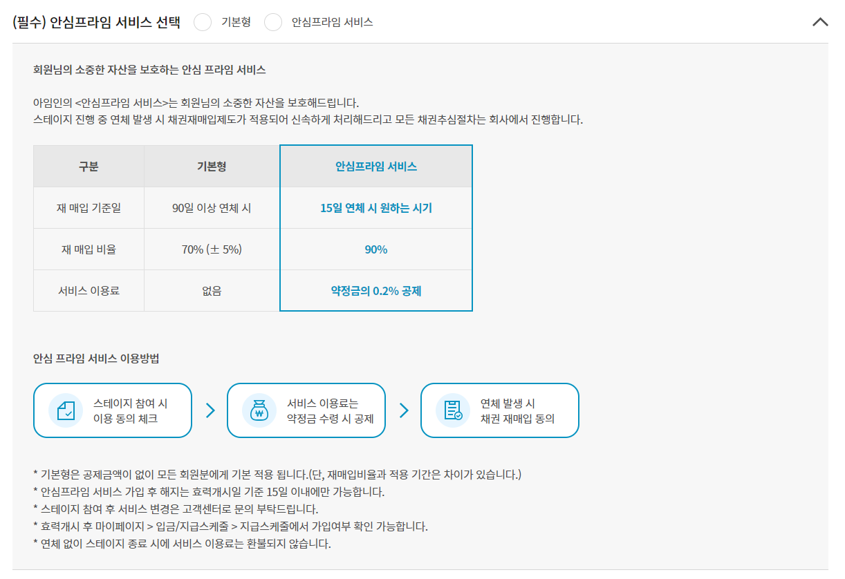 그렇다면 사고발생시에는 어떻게 되는걸까요? 하나의 "계"를 아임인에서는 "스테이지" 라고 표현하는데, 안심프라임 서비스를 기본형과 프라임형으로 선택할수가 있습니다. 기본형은 앞사람이 90일이상 연체를 했을때, 70% (5% + -)범위 내에서 재매입, 즉 약70% 정도만 보호를 해줍니다. 그래도 90일 이상 연체를 해야 재매입을 해주므로 자금이 내가 생각했던 것보다 더 오래 묶일수가 있게 됩니다. 또한 총 입금금액의 70%만 재매입을 해주므로 30%는 나의 채권으로써 존재하게 됩니다. 채권자로써 상황이 복잡해질수가 있겠네요. 프라임으로 설정 하더라도 재매입 비중이 90%에 제한됩니다. 10%는 받을수도, 못받을수도 있습니다.
